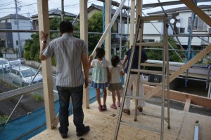 式の後、お施主様ご家族の方々に梯子で2階の仮床に上がっていただき、2階からの雰囲気を感じていただきました。ちょうど暑さも和らぎ、通り抜けていく風の心地良さが大変印象的でもありました。