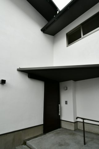 アプローチを進むと、玄関となります。手摺りもあり、高齢者の方への配慮も為されています。
